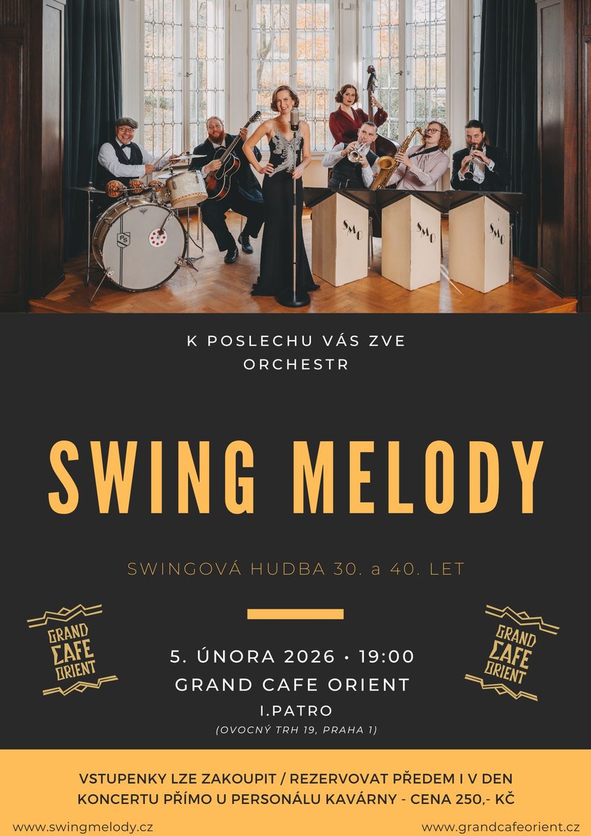 The Grand Café Orient will host a concert by the SWING MELODY orchestra – Swing music of the 1930s and 1940s on February 5, 2026 from 7:00 p.m.